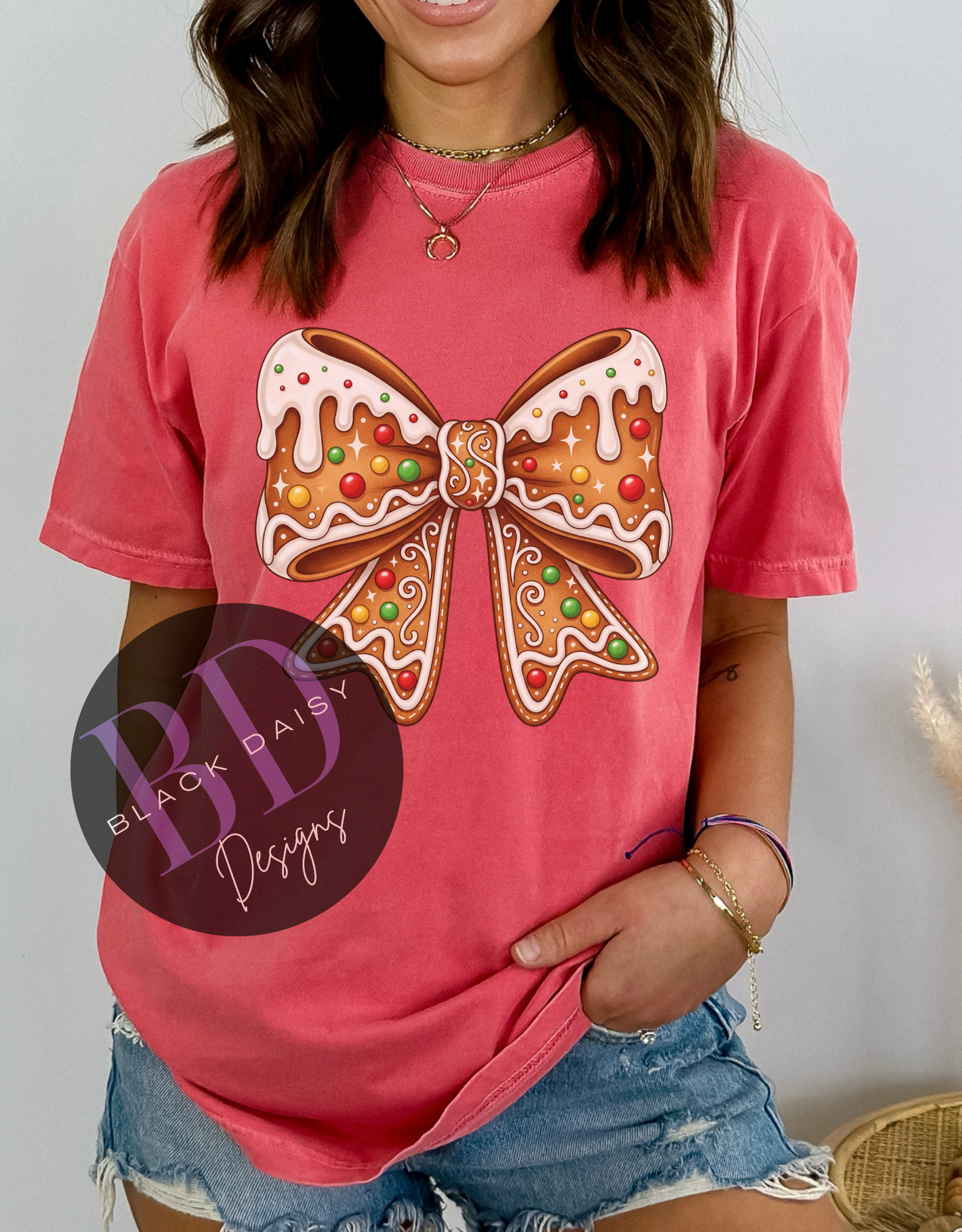 This cozy Comfort Colors t-shirt features a festive gingerbread bow that adds a cute touch to your holiday wardrobe. Perfect for any occasion, this t-shirt is both comfortable and stylish. 'Tis the season to look adorable!
